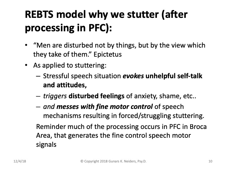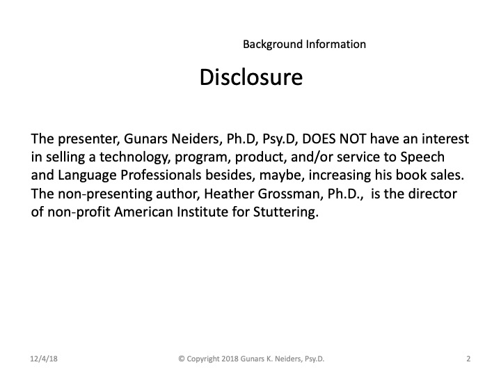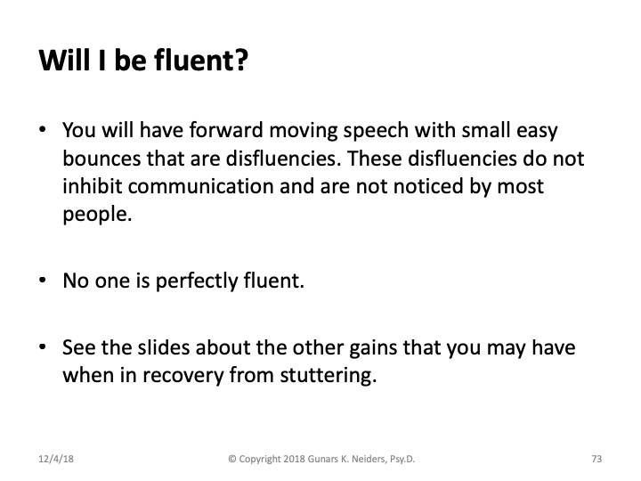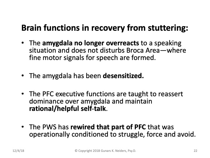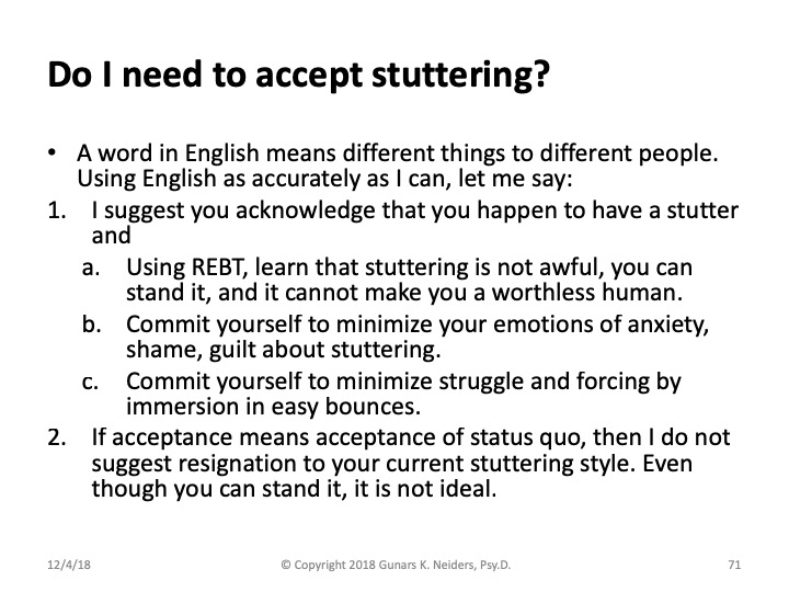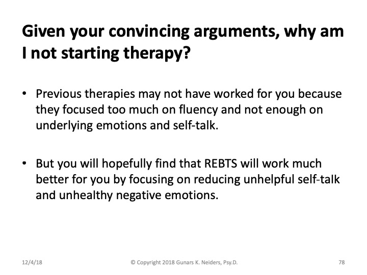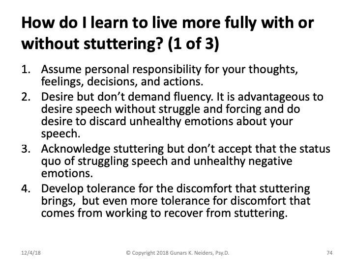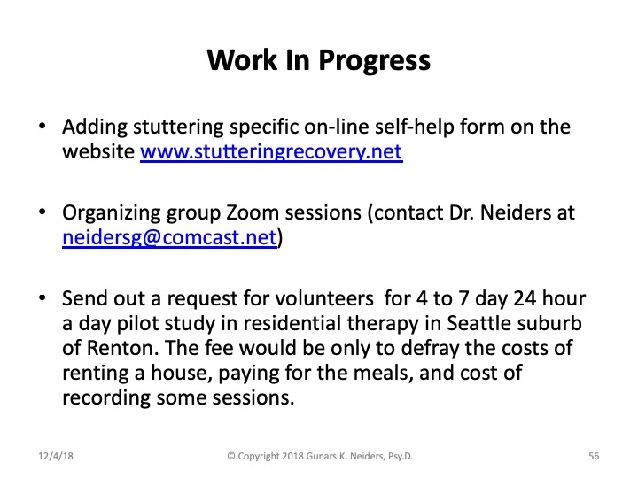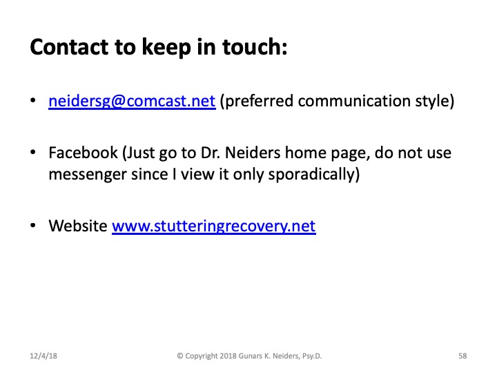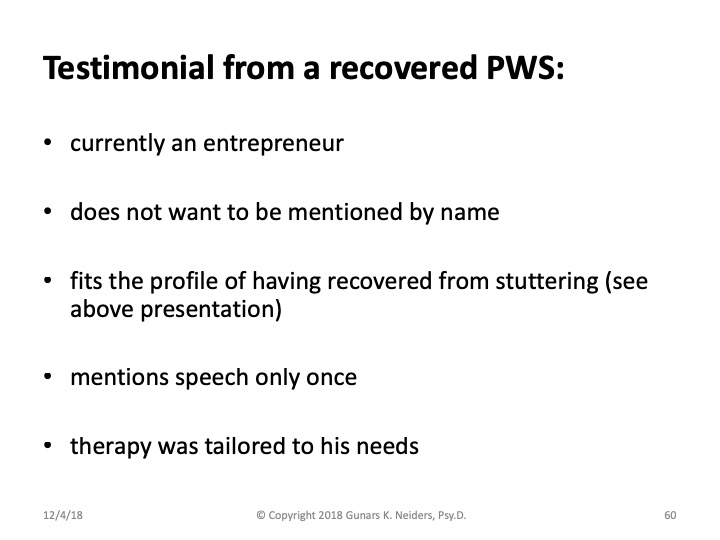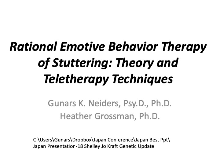 Presented in Hiroshima, Japan in July 2018 as a part of the International Fluency Association’s World Congress event, this bold new look into stuttering therapy techniques covers much of the process that Dr. Neiders uses to assist his patients in living their best possible lives. Use the ‘pop-out’ button in the upper right corner to view in another tab, and scroll down to navigate through the slides.