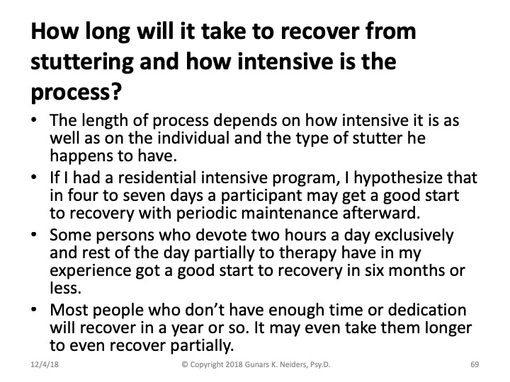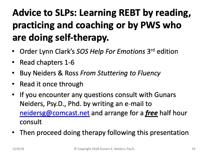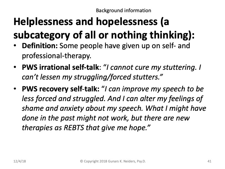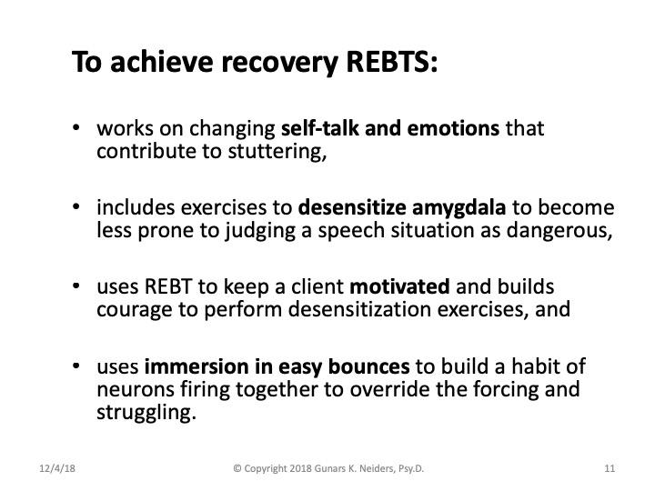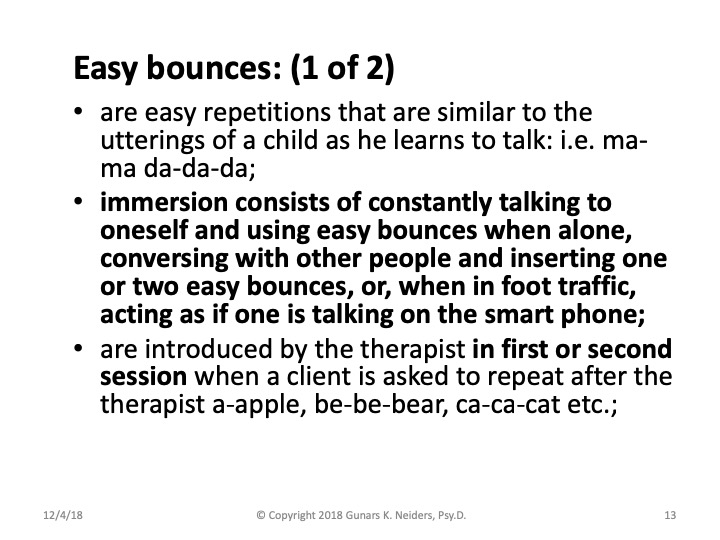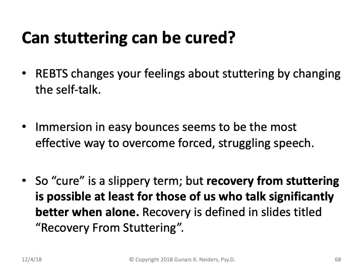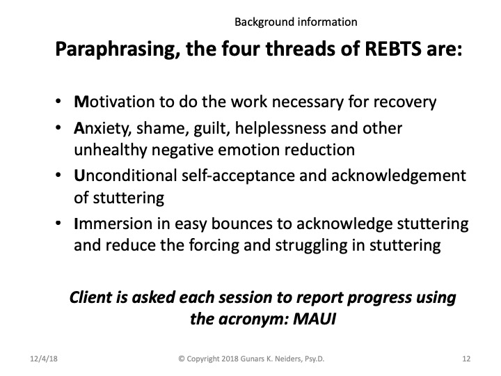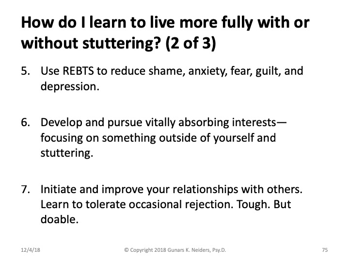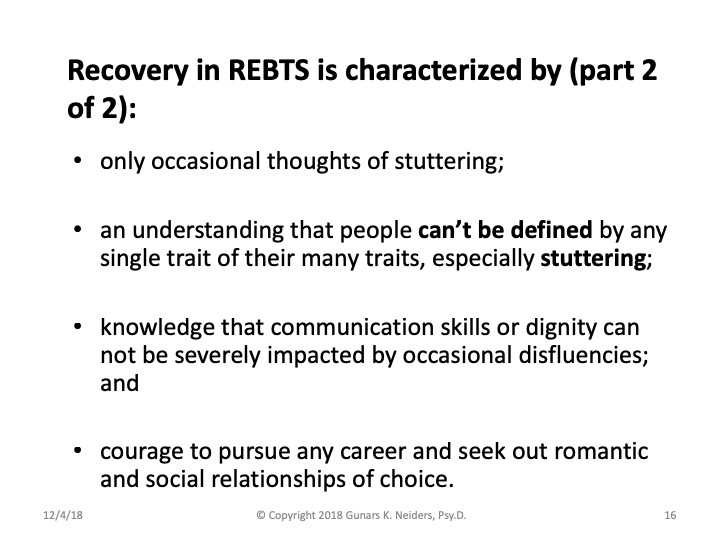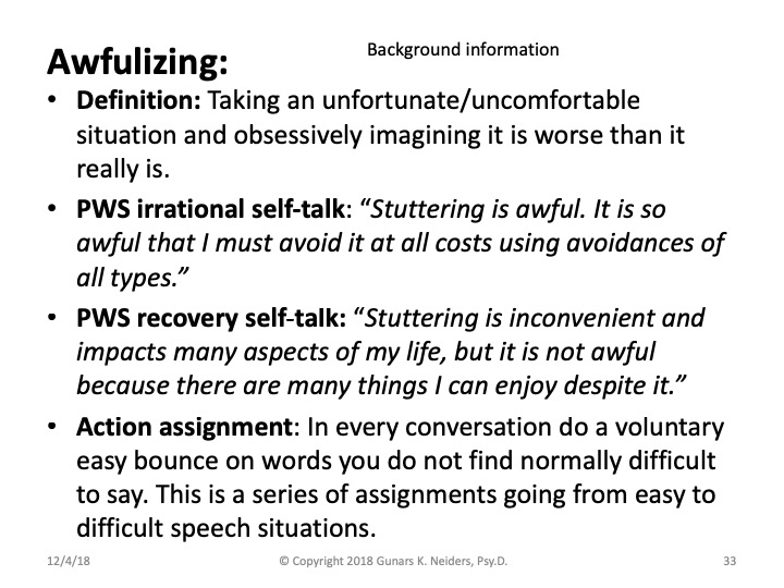 Presented in Hiroshima, Japan in July 2018 as a part of the International Fluency Association’s World Congress event, this bold new look into stuttering therapy techniques covers much of the process that Dr. Neiders uses to assist his patients in living their best possible lives. Use the ‘pop-out’ button in the upper right corner to view in another tab, and scroll down to navigate through the slides.