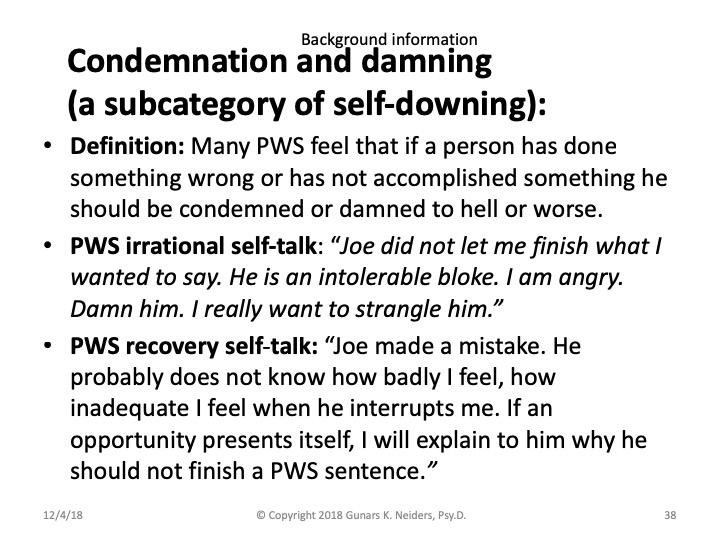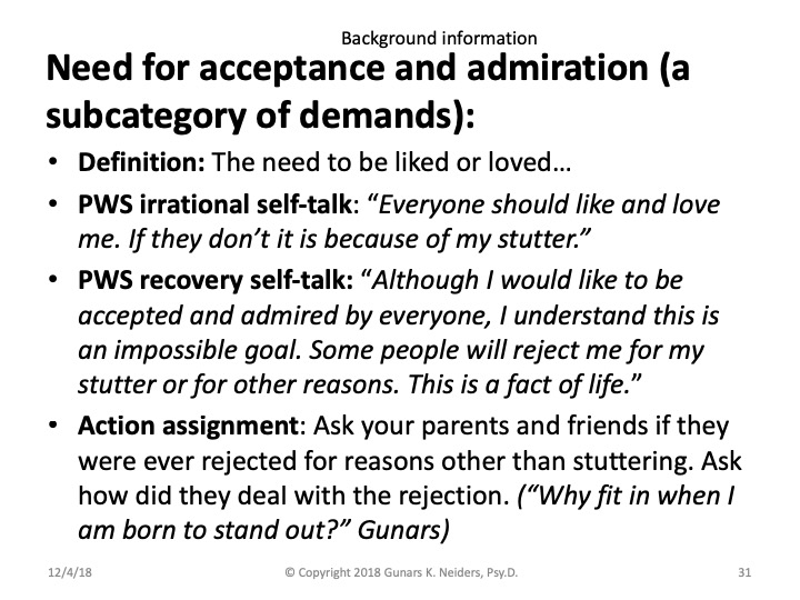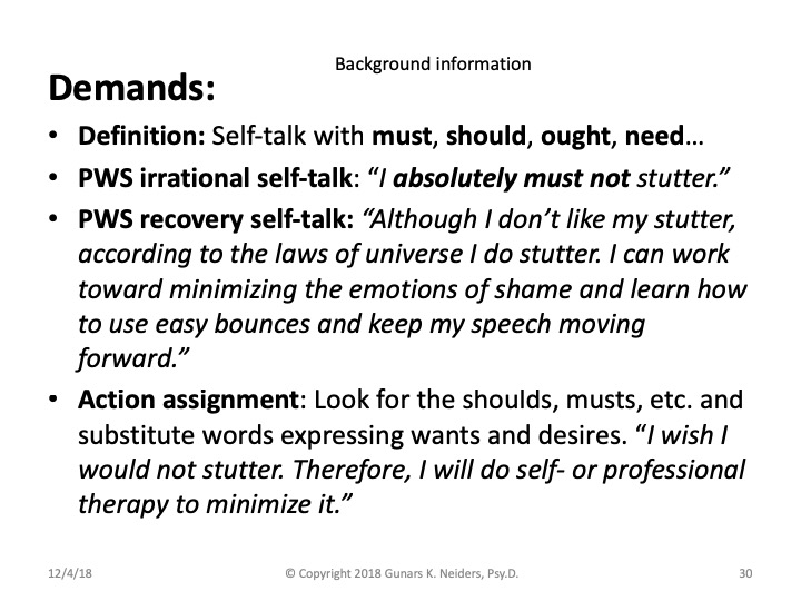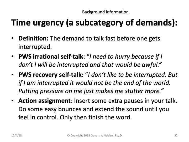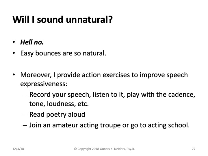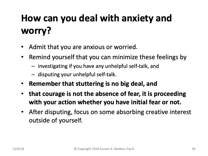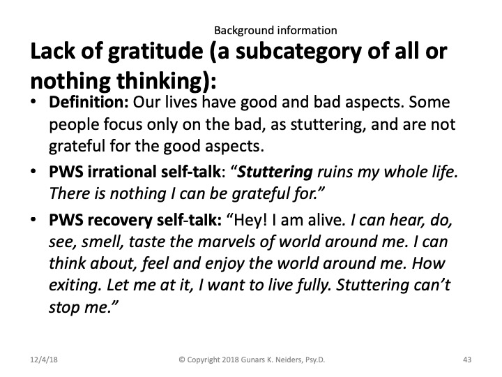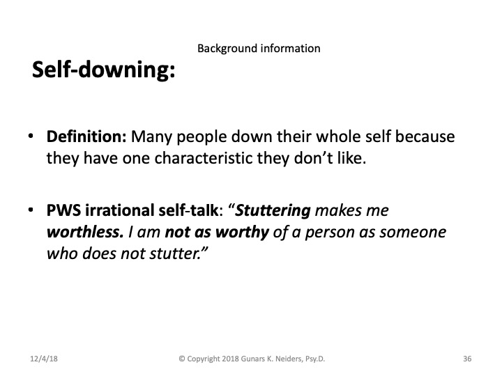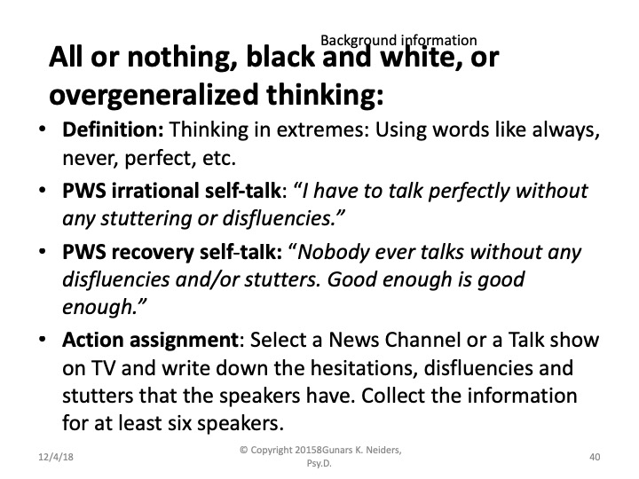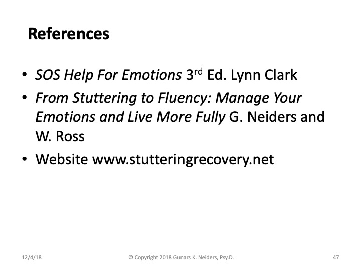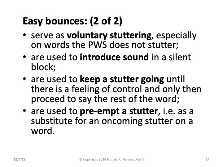 Presented in Hiroshima, Japan in July 2018 as a part of the International Fluency Association’s World Congress event, this bold new look into stuttering therapy techniques covers much of the process that Dr. Neiders uses to assist his patients in living their best possible lives. Use the ‘pop-out’ button in the upper right corner to view in another tab, and scroll down to navigate through the slides.